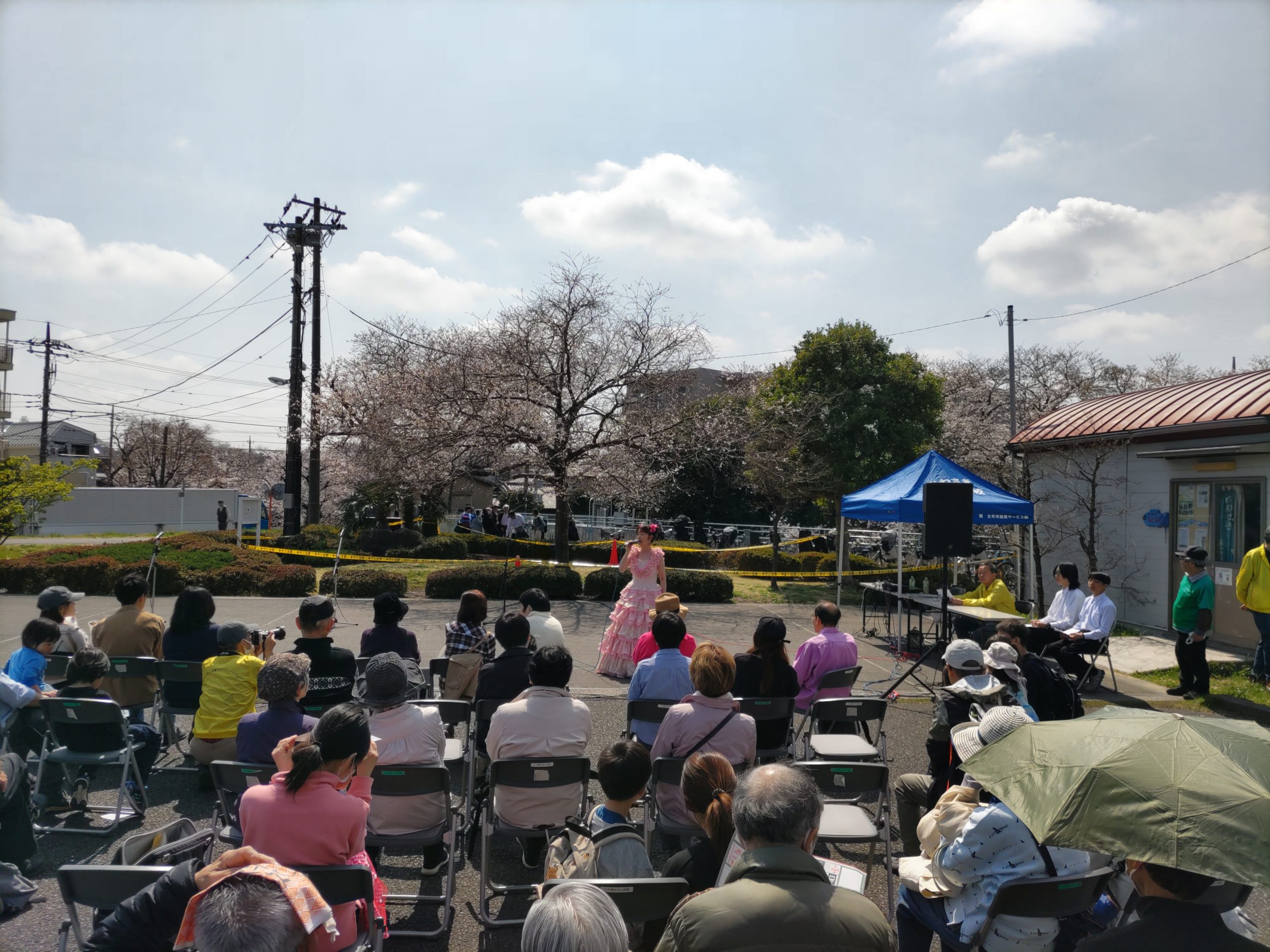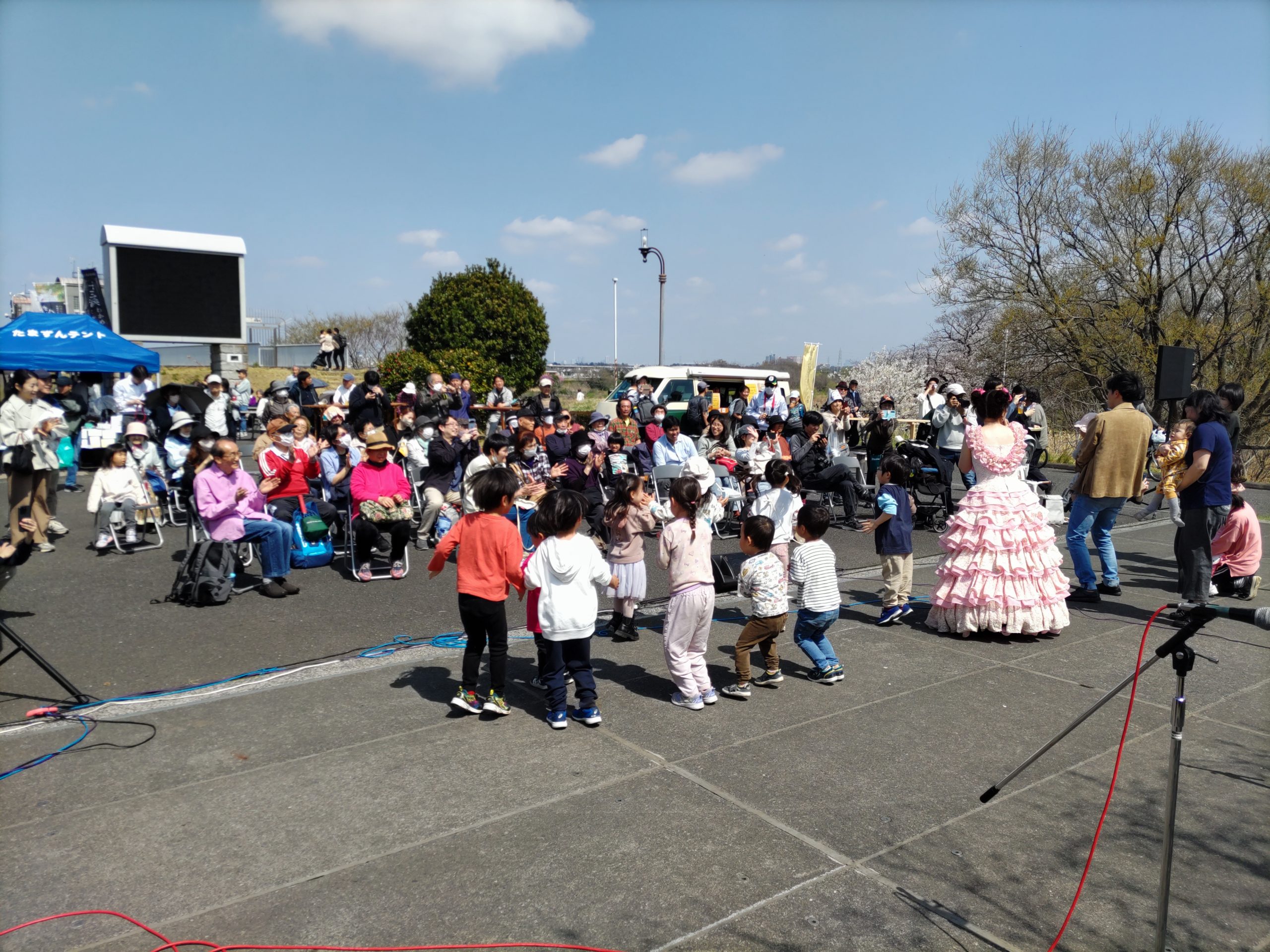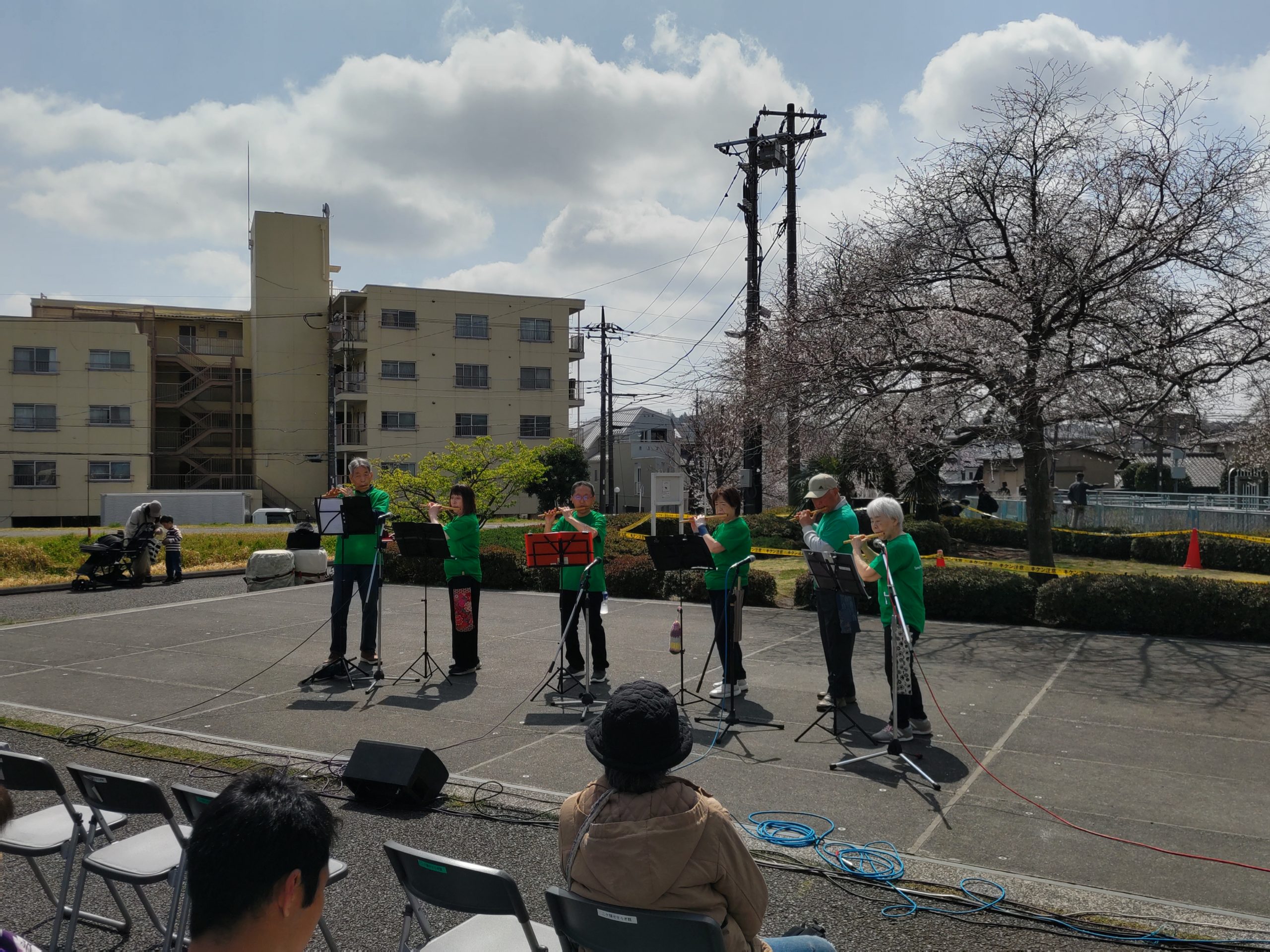 2026年3月28日に開催されました『第21回多摩川桜のコンサート』。晴れましたのですべての演目が行われ、多くの観衆が二ヶ領せせらぎ館前広場に集いました。青空のもと桜の下で演奏するのは最高です。