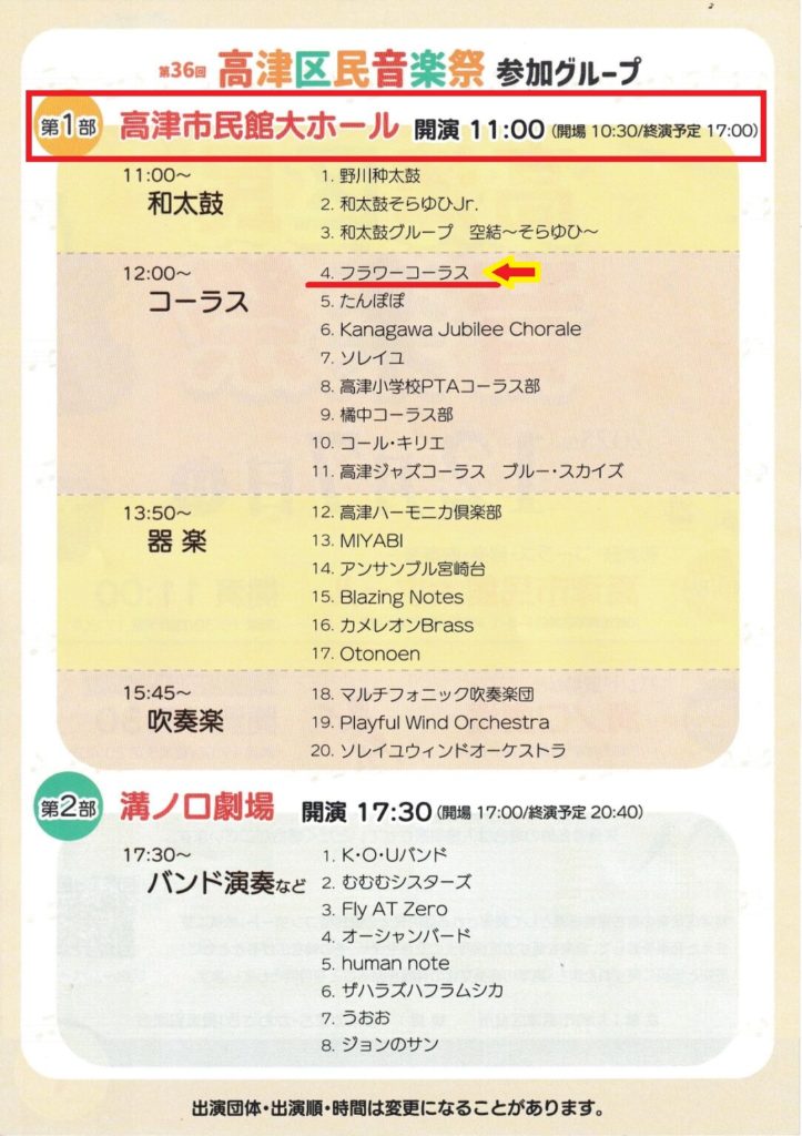 『フラワーコーラス』の出番は、コーラス部門の1番目(高津市民館大ホール開催の4番目)の12時頃になります。