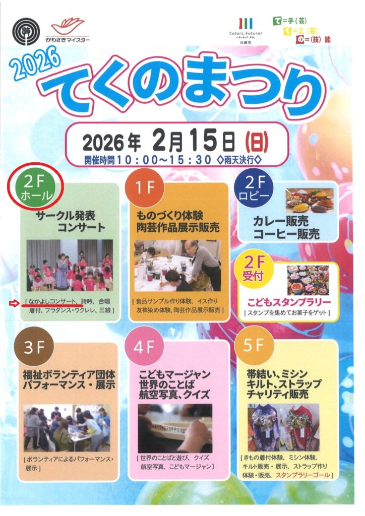 2026年2月15日に、てくのかわさきで開催される「てくのまつり2026」に出演させていただきます。元気爆発の『親子でなかよしコンサート』へ、ぜひご来場くださいね。