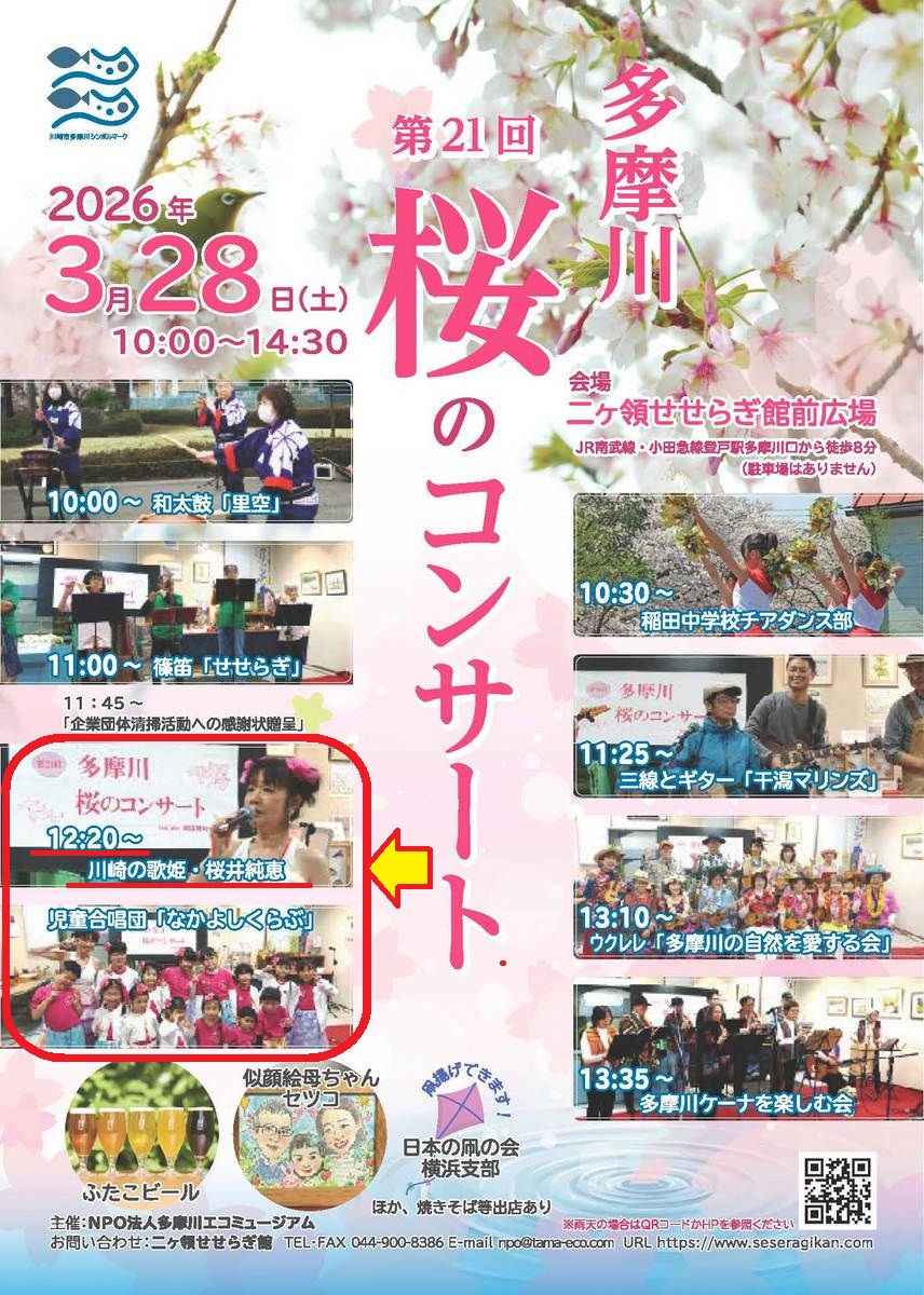 2026年3月28日(土)に、二ヶ領せせらぎ館前広場で開催されます「第21回多摩川桜のコンサート」に出演いたします。どうぞご来場くださいね。 桜井純恵の登場時間は12時20分頃になります。桜井純恵のステージに加え、児童合唱団なかよしくらぶとのコラボ歌唱そして幼児サロンリトミックも行います!